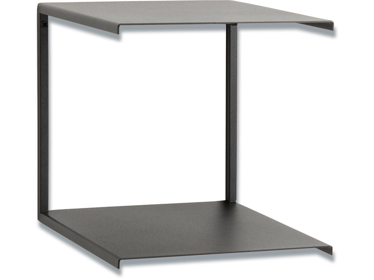 Dobbelt hylde, sort metal. 20 x 20 x 20 cm. Brug den til opbevaring af magasiner, bøger, planter og andre småting.
