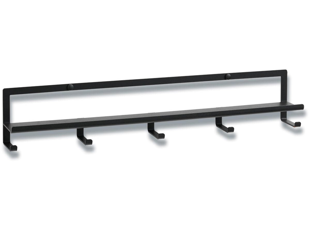 Hylde med knager, sort metal. 6 knager, længde 45 cm.