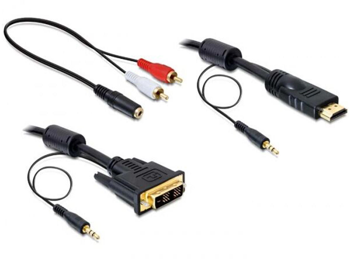 This DVI – HDMI cable by Delock enables you to connect a monitor to your PC. Thus you can connect the cable to a HDMI graphics card and to a DVI monitor. Furthermore the cable can be connected to a DVI graphics card and to a HDMI monitor. For audio transfer just plug the two additional audio connector to the sound card and the monitor.