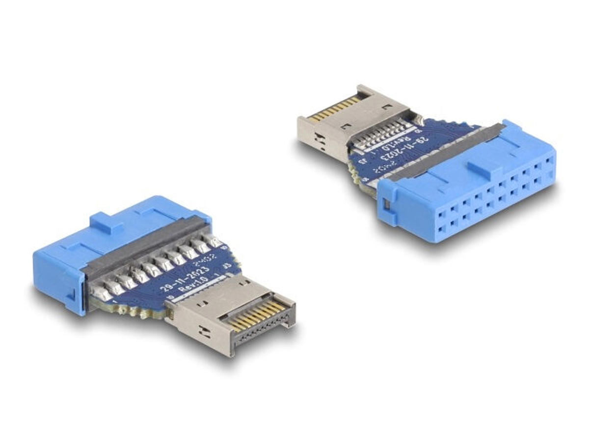 This adapter by Delock converts the internal USB pin header male into the internal USB Type-E Key A male. Various cables can be connected to the adapter, to provide either one USB Type-C™ or one USB Type-A interface.