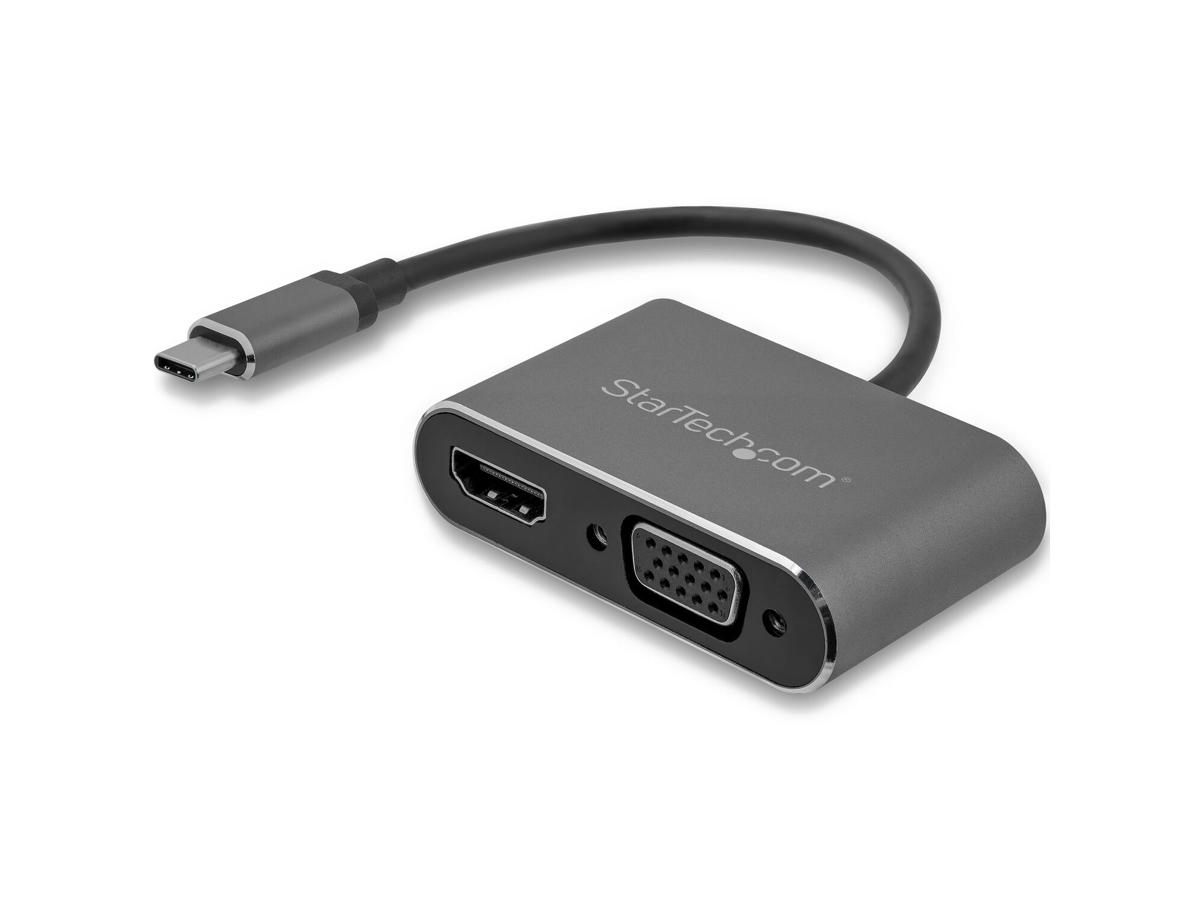 This USB-C to VGA and HDMI adapter offers a portable solution for connecting your USB Type-C laptop to a VGA or HDMI display. The multiport video adapter also works as a splitter, enabling you to simultaneously output an identical video signal to two separate monitors (1 x HDMI and 1 x VGA).