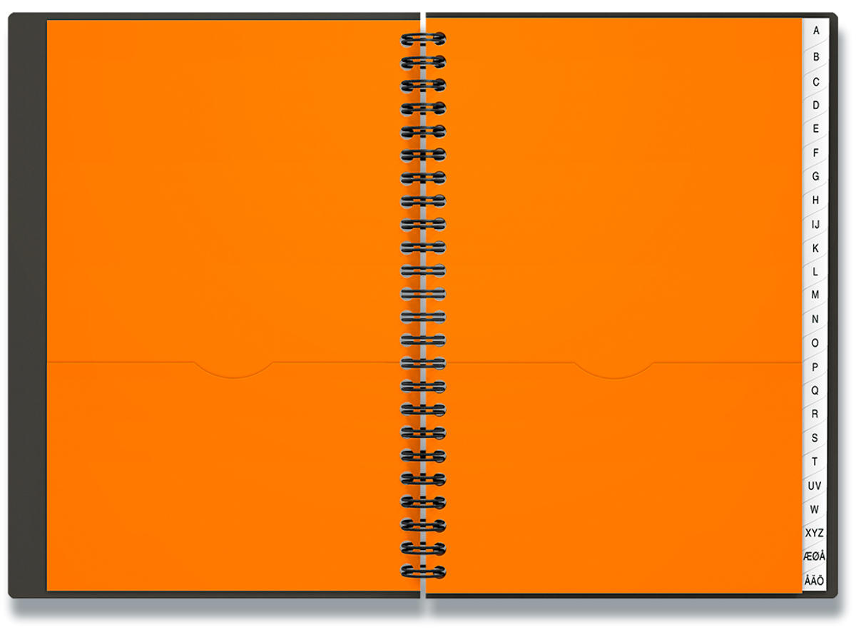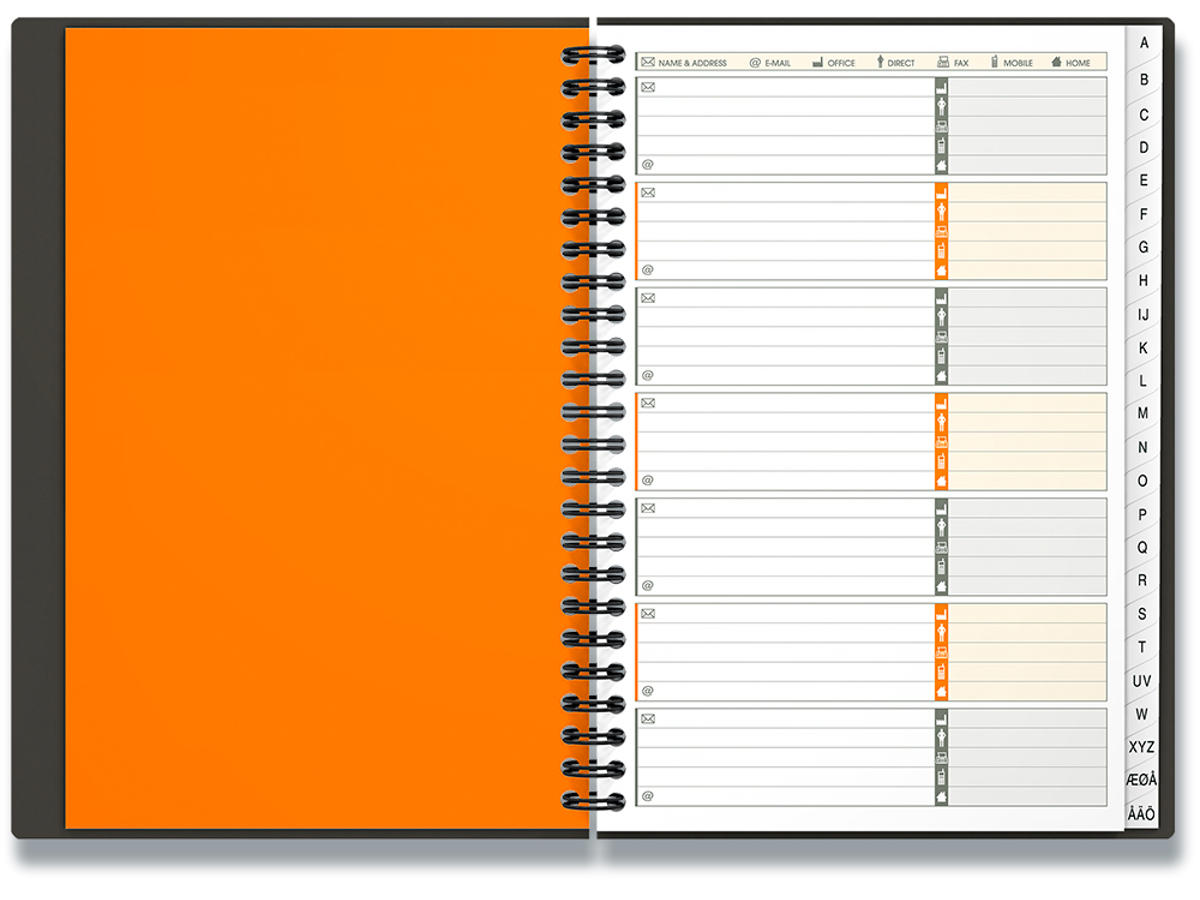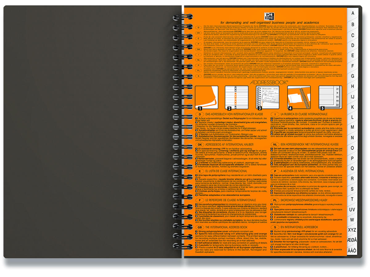Til overblikket over de internationale kontakter. Eksklusiv adressebog med 2-farvet linjering for bedre overblik og god plads til alle kontaktdetaljer. Slidstærke, laminerede indeksfaner fra A til Å til alle de internationale kontakter. Let ajourføring af bogen med de medfølgende rettelseslabels. Praktisk spiralryg samt integrerede lommer til visitkort og kvitteringer. Omslag i let, slidstærk og smudsafvisende polypro samt optisk, hvidt papir, der er behageligt at skrive på og silkeblødt at røre ved. Nyttige internationale informationer om tidszoner, hovedstæder og telefonforvalgsnumre til hele verden. Handy A5-format, der er let at medbringe på rejsen.