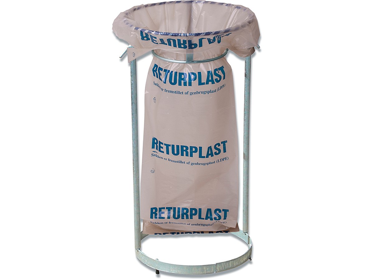OBS! Sælges uden stativ. Affaldssæk der er fremstillet af genbrugsplast. Sækken er lavet som en T-Shirt bag med Returplast tryk. Den er samtidig med 2 rækker huller.