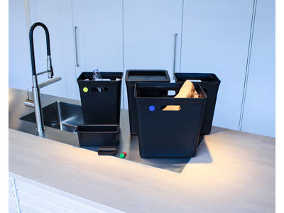 Serien består af 3 forskellige størrelse beholdere, låg, indsats til små dele, farvekodede prikker og skilte.