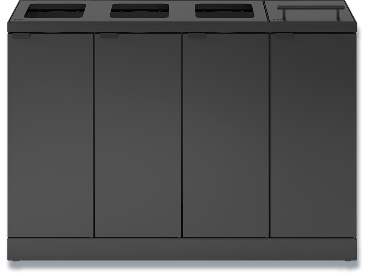Fleksibelt affaldssystem fra Bica sikrer nem og brugervenlig affaldssortering på arbejdspladsen. Affaldssystemet er designet med 4 fraktioner med henholdsvis 3 åbne indkast og 1 med løftelåg. Formålet med låget er at minimere lugtgener og forhindre bananfluer ved sortering af madaffald. En rigtig smart løsning, hvis posen ikke tømmes så ofte.