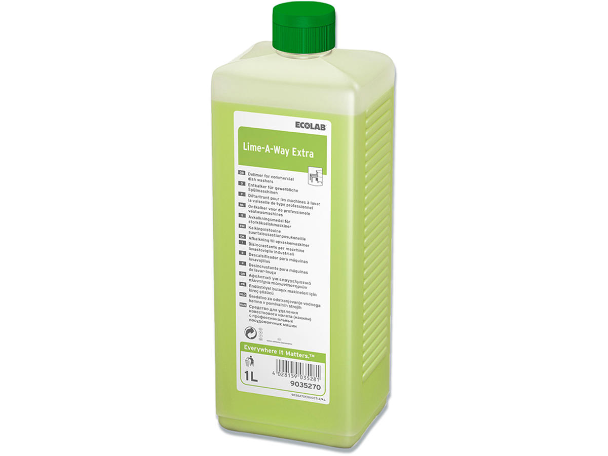 Rengøringsmiddel til fjernelse af kraftige kalkbelægninger. Til afkalkning af opvaskemaskiners skyllezone, kogekar, industrikaffemaskiner, vaskemaskiner samt stengulve, flisevægge og sanitet. Lime-A-Way Extra angriber kobber og zinklegeringer samt porøs emalje og marmor.