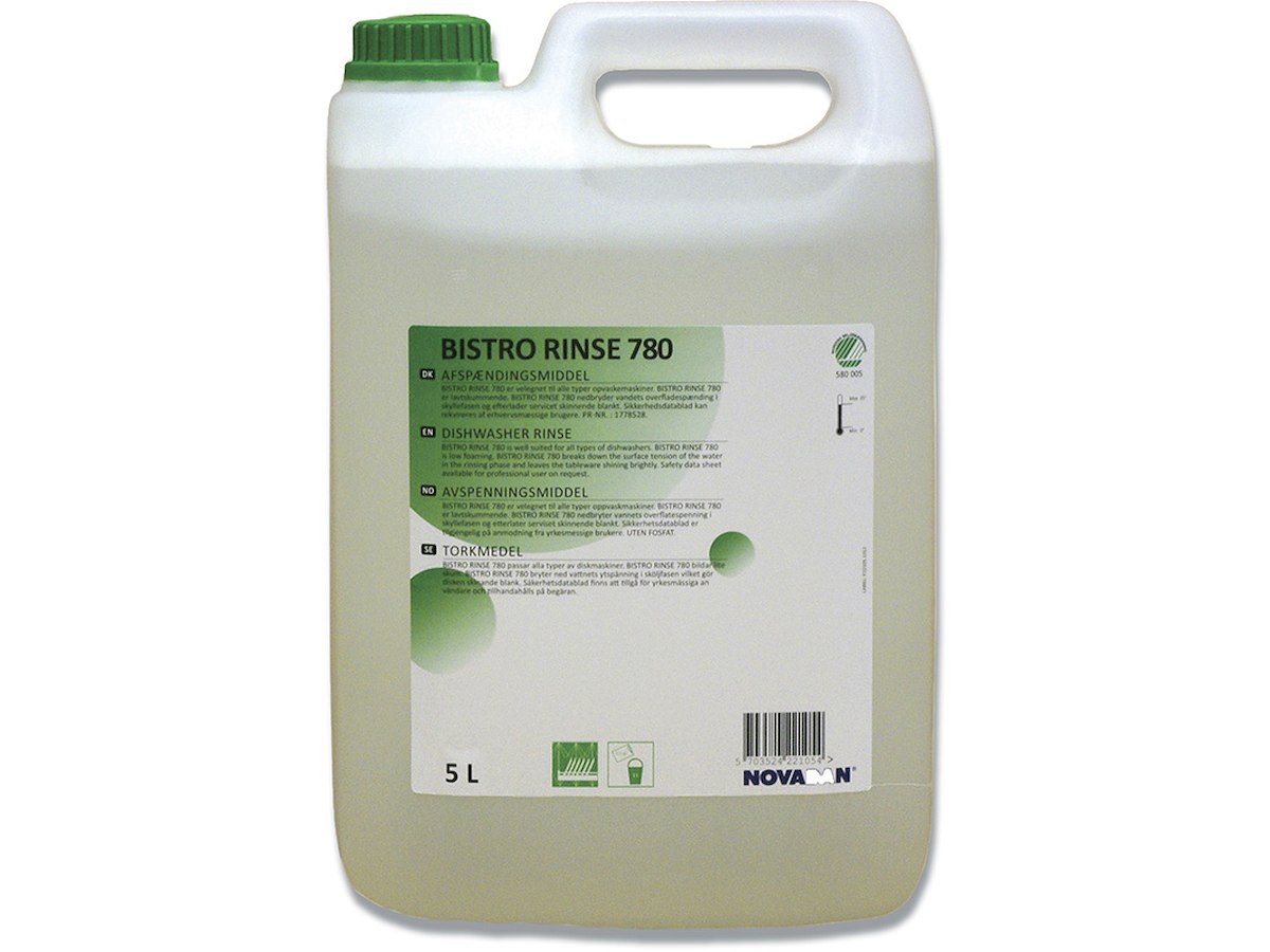 Neutralt afspændingsmiddel til maskinopvask. Bistro Rinse 780 er velegnet til alle typer opvaskemaskiner. Bistro Rinse 780 er lavtskummende. Bistro Rinse 780 nedbryder vandets overfladespænding i skyllefasen og efterlader servicet skinnende blankt.
