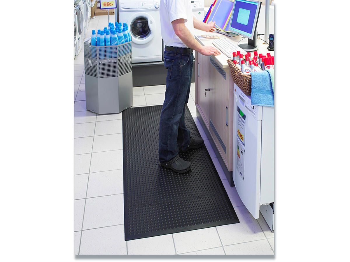 Arbejdspladsmåtte med en bobleformet overside. Undersiden har et sugekop-mønster, der gør, at måtten suger sig fast til gulvet og bliver liggende. Med det smarte modulsystems ende- og midterstykker bygger du selv måtten til den ønskede størrelse. Da måtten er af ren gummi er den mest velegnet i industrimiljøer.