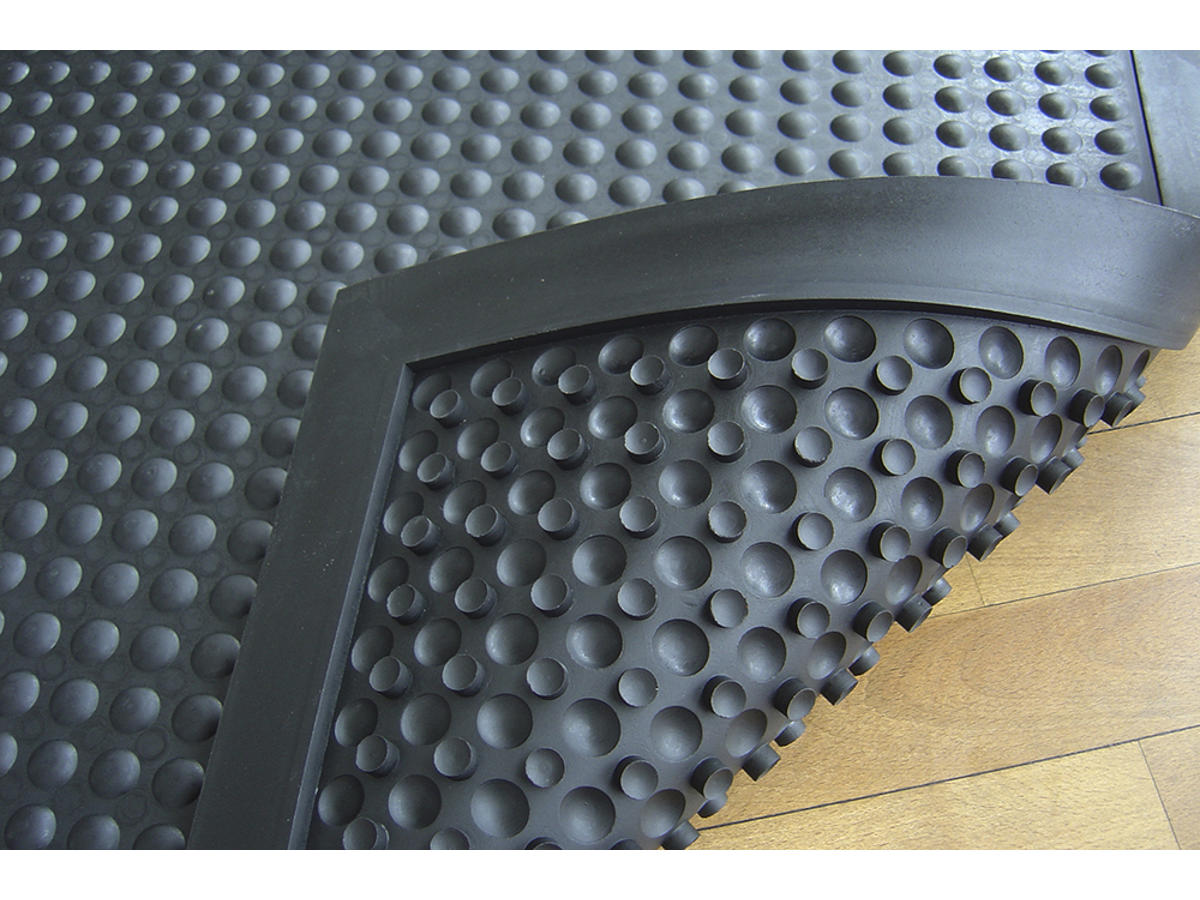 Arbejdspladsmåtte som er fremstillet helt i naturgummi, hvilket gør den blød og dæmpende. Oversidens bobler stimulerer fødderne og øger blodcirkulationen. Undersiden er forsynet med sugekopper, som sørger for, at måtten ligger stille, men hjælper også med til at gøre måtten endnu mere dæmpende. Med affaset kant som reducerer snublerisikoen.