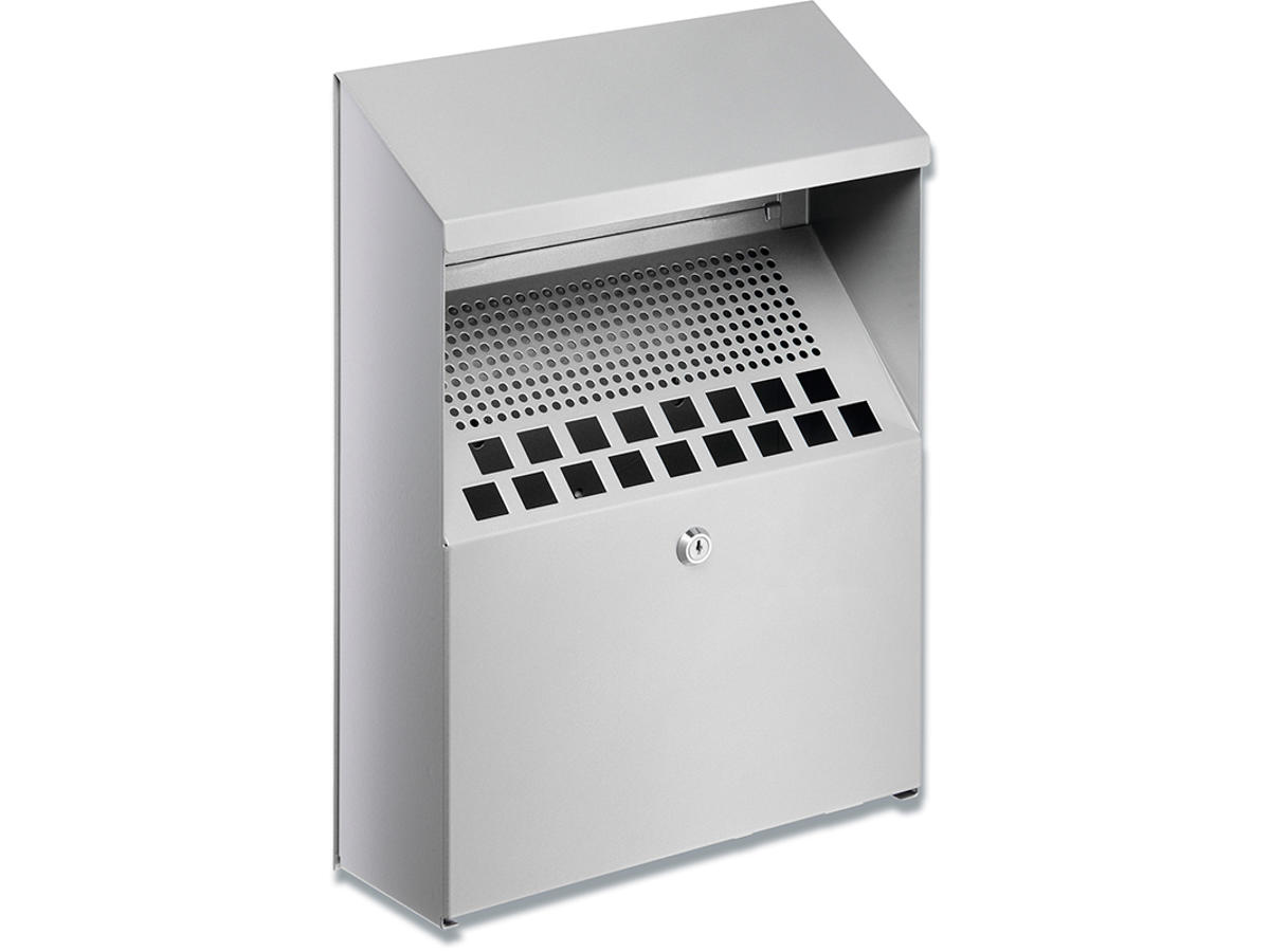 Praktisk askebæger af metal med ridsefast polyesterbelægning velegnet til udendørs vægmontering (bør monteres under tag/udhæng). Låsbar tømmingsluge, inkl.2 nøgler, med indvendig beholder, som er enkel at tømme. Kapacitet 4 liter. Mål: BxHxD 310x450x107mm