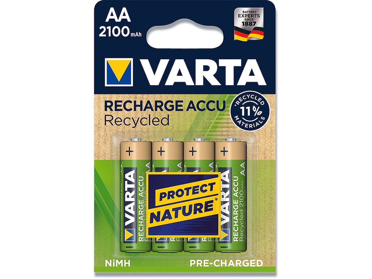 Opladet på forhånd, klar til brug. Meget lav selvafladning. Genopladelig uden hukommelseseffekt. Passer til alle opladere og alle standardenheder. Recycled indeholder 11% genanvendt materiale pr. batteri.