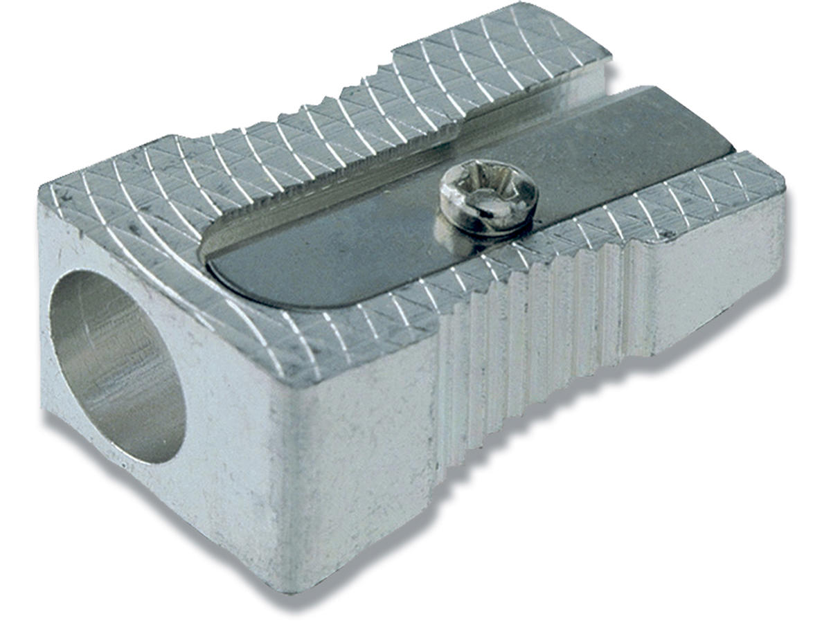Blyantspidser m/enkelt hul. Børstet aluminium med skruet blad. Passer til de fleste blyanter.
