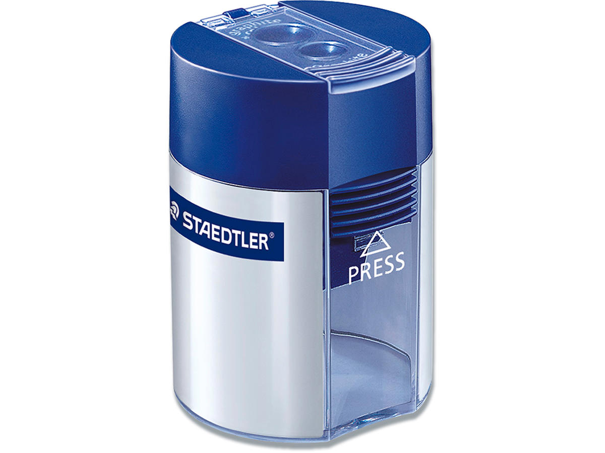 Dobbelt blyantsspidser med beholder. Den kan spidse tykke og tynde blyanter, farveblyanter mv. Der er metal spidser i, hvilket gør det til en god, solid og holdbar blyantspidser. Det er nemt at tage låget af, så den kan tømmes. Spidser i en vinkel 23° til alm. blyanter og til tykke farveblyanter og blyanter i en vinkel på 30° til brede, bløde linjer.