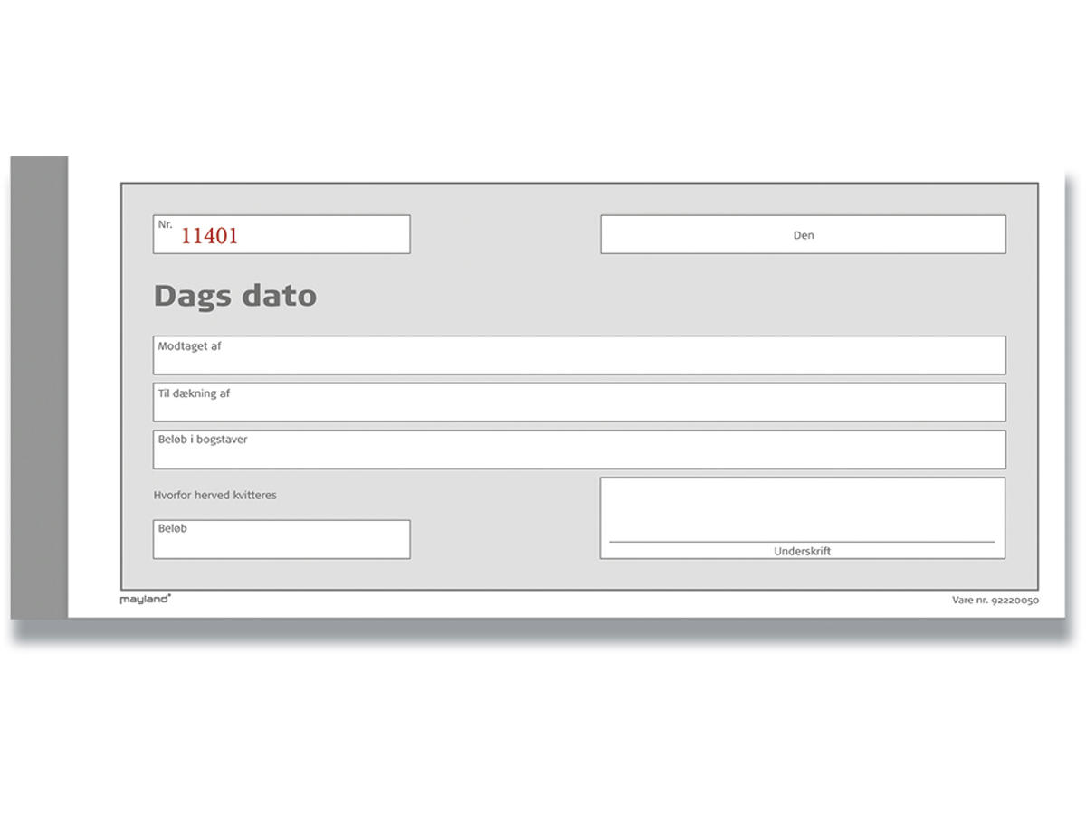 Dags Dato 2x50 sider med kopi, 210x100 mm. Dags Dato-blok med 2x50 nummererede sider, 1 kopi og indlagt karbonpapir. Der er felter til dato, modtager, beløb i tal og bogstaver, hvad beløbet skal dække, samt underskrift for modtagelse.