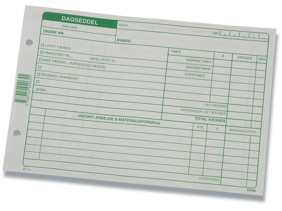 Praktisk dagseddelbog som indeholder blanketter med mange kolonner og fortrykte tekster. Med mulighed for angivelse af normaltimer, overtids timer til forskellige takster, materialeforbrug med mere. En registreringsseddel der gør det nemt og overskueligt at lave lønafregning.