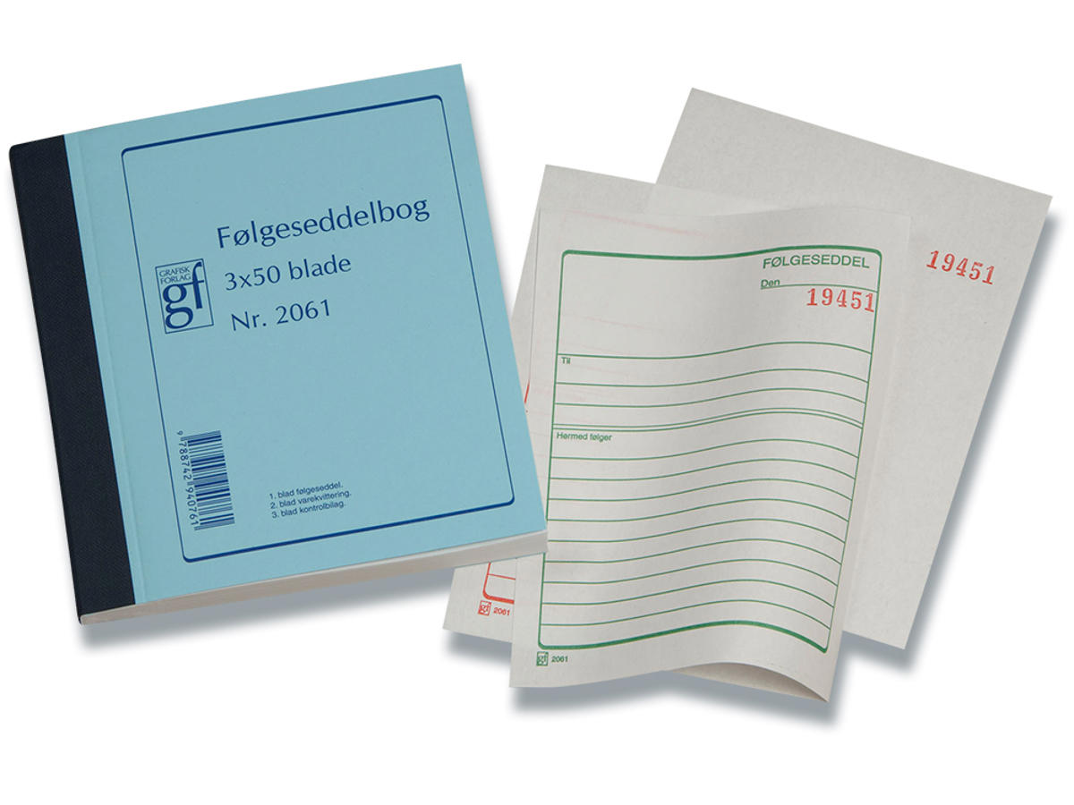 En følgeseddels blanket med fortrykt tekst og linje til notering af dato, inklusiv 2 kopier. Et stort afgrænset felt, giver plads til notering af firmanavn og adresse på virksomheden som skal modtage varerne. På de fortrykte sider, er der rigeligt med plads til notering af varenumre og varetekst. De nummererede sider i denne kvitteringsblok hænger sammen 2 og 2, så man nemt kan lave en kopi. Den grønne original skilles let fra den røde kopi, ved hjælp af perforering i højre side. Efterfølgende kopi følger ligeledes nummerserien, men har dog inden fortrykte linjer og kolonner.