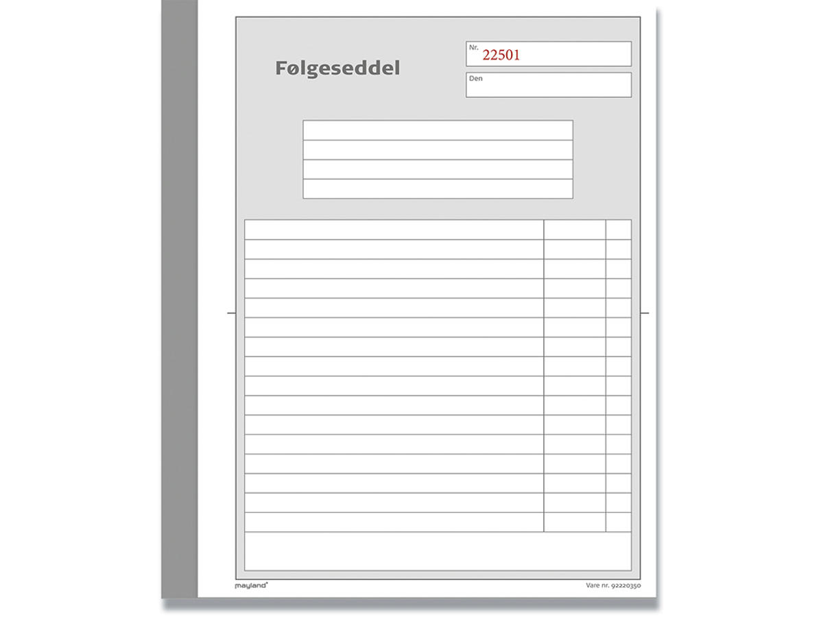 Følgeseddelbog. 2x50 sider, 148x200 mm. Følgeseddelbog med 1 kopi og indlagt karbonpapir. Brug f.eks. bogen til at skrive, hvad pakker indeholder, hvad du vil bestille, eller hvad du har modtaget. Siderne er nummererede og har felter til firmastempel, modtager eller noter, dato og 16 linjer til specifikation af følgesedlen og beløb.