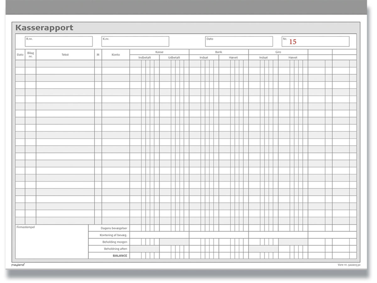 Kasserapport. 2x50 sider m. kopi, 297x228 mm. Blok med nummererede kasserapporter, der har kolonner til kasse, bank, giro og en ekstra kolonne. Der er 23 linjer til posteringer, datofelt, felt til firmastempel, felter til afstemning samt R.nr. og K.nr. Karbonpapir er indlagt i blokken, så det, der skrives på originalen, automatisk bliver kopieret til bilag til bogholderi eller revisor.