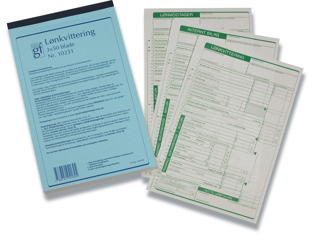 Blanketter til beregning af løn, feriepenge, skatteberegning med videre. Denne lønkvitteringer indeholder fortrykte felter, som er nødvendige for at lave en specificeret og korrekt lønberegning. Med fortrykte felter og sammentællingskolonner, er denne lønseddel med til at gøre det nemt at lave lønafregning, samt give et godt overblik over de enkelte takster og beregninger. De 2 efterfølgende kopier har fortrykt tekst, som tydeligt angiver hvilket der arkiveres som internt bilag og hvilken blanket der afleveres hos lønmodtager.