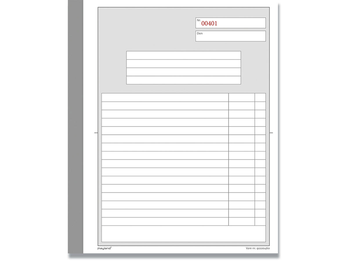 Triplikatbog m. talkolonne. 3x50 sider m. kopi, 148x200 mm. klassisk triplikatbog, der kan bruges til mange forskellige formål i virksomheden, fx følgesedler, regninger, rekvisitioner, timesedler og meget mere. Bogen indeholder 3x50 sider og indlagt karbonpapir. Siderne er nummererede og har felter til dato, firmastempel eller modtager, notater og 16 linjer med talkolonne.