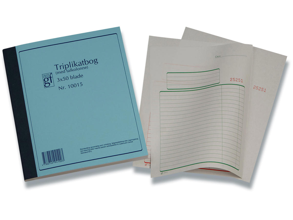 På den øverste del af kvitteringerne, er der plads til at notere firma navn og andre virksomhedsoplysninger, i den linjerede boks. Triplikatbog har nummererede sider på original samt 2 kopier. De fortrykte linjer er perfekt til notering af tekst i forbindelse med levering af varer eller eventuelt for varer som er udleveret i udvalg. Siderne har ligeledes en kolonne til angivelse af beløb i kroner og ører. De nummererede sider i denne kvitteringsblok hænger sammen 2 og 2, så man nemt kan lave en kopi. Efterfølgende kopi følger ligeledes nummerserien, men har dog inden fortrykte linjer og kolonner. Den grønne original skilles let fra den røde kopi, ved hjælp af perforering i højre side.