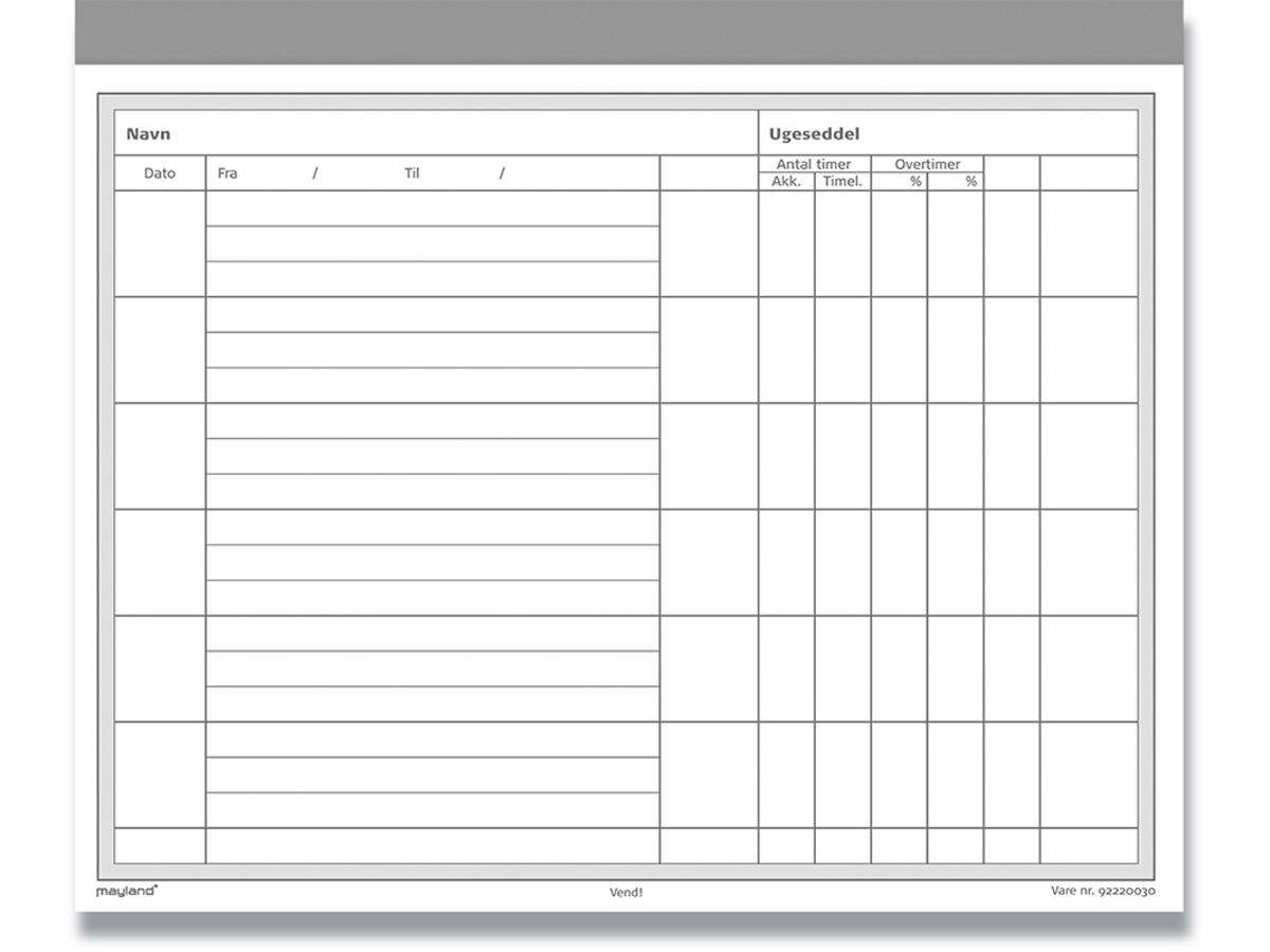 Ugesedler 2x50 sider m. kopi, 200x148 mm. Blok med arbejdsordre og lønseddel på en side og indlagt karbonpapir. Hver seddel har 6 felter til opgaver med tilhørende dato, timer og overtimer.
