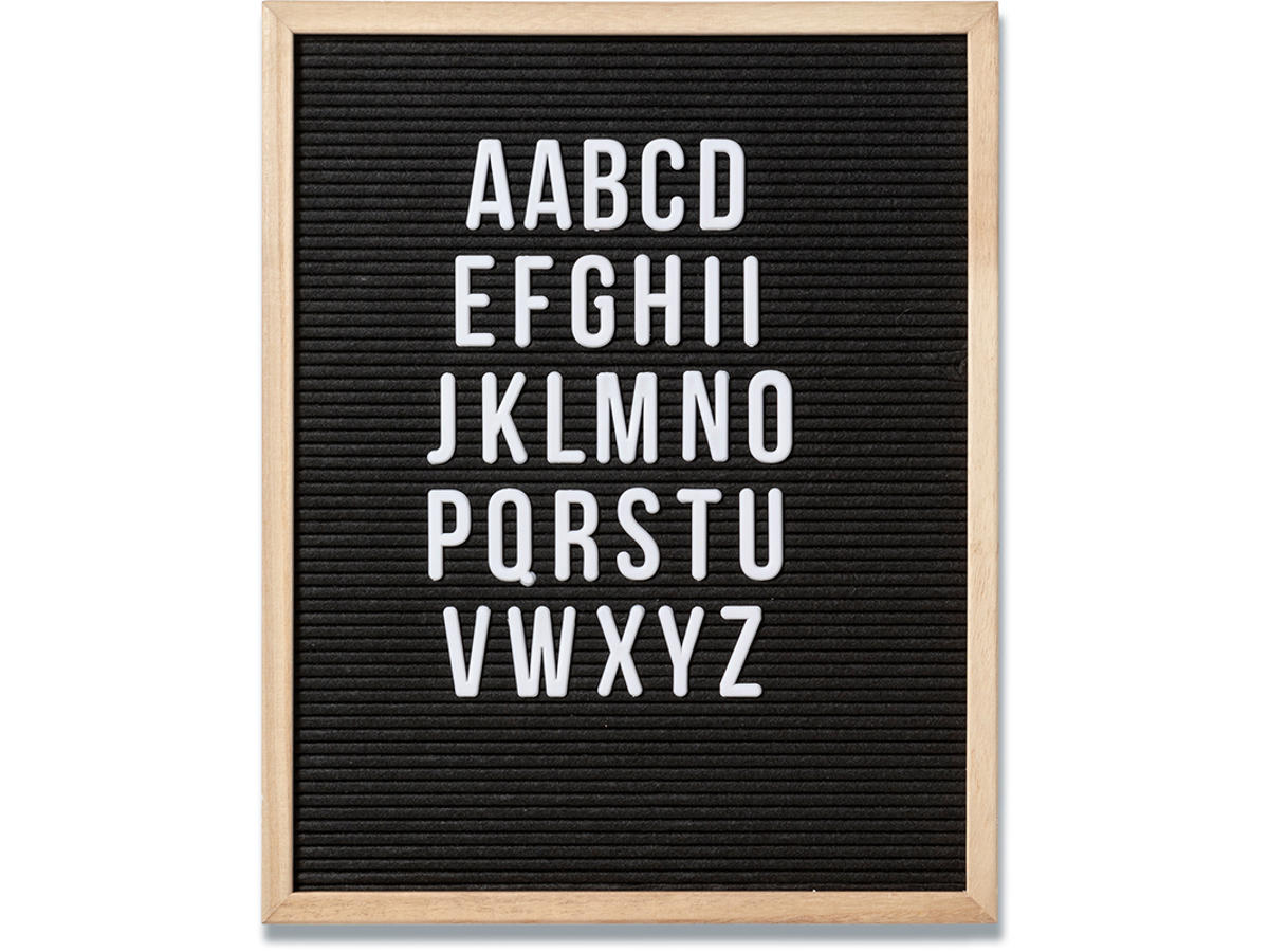 28 hvide udskiftelige bogstaver, som måler 5 cm i højden.