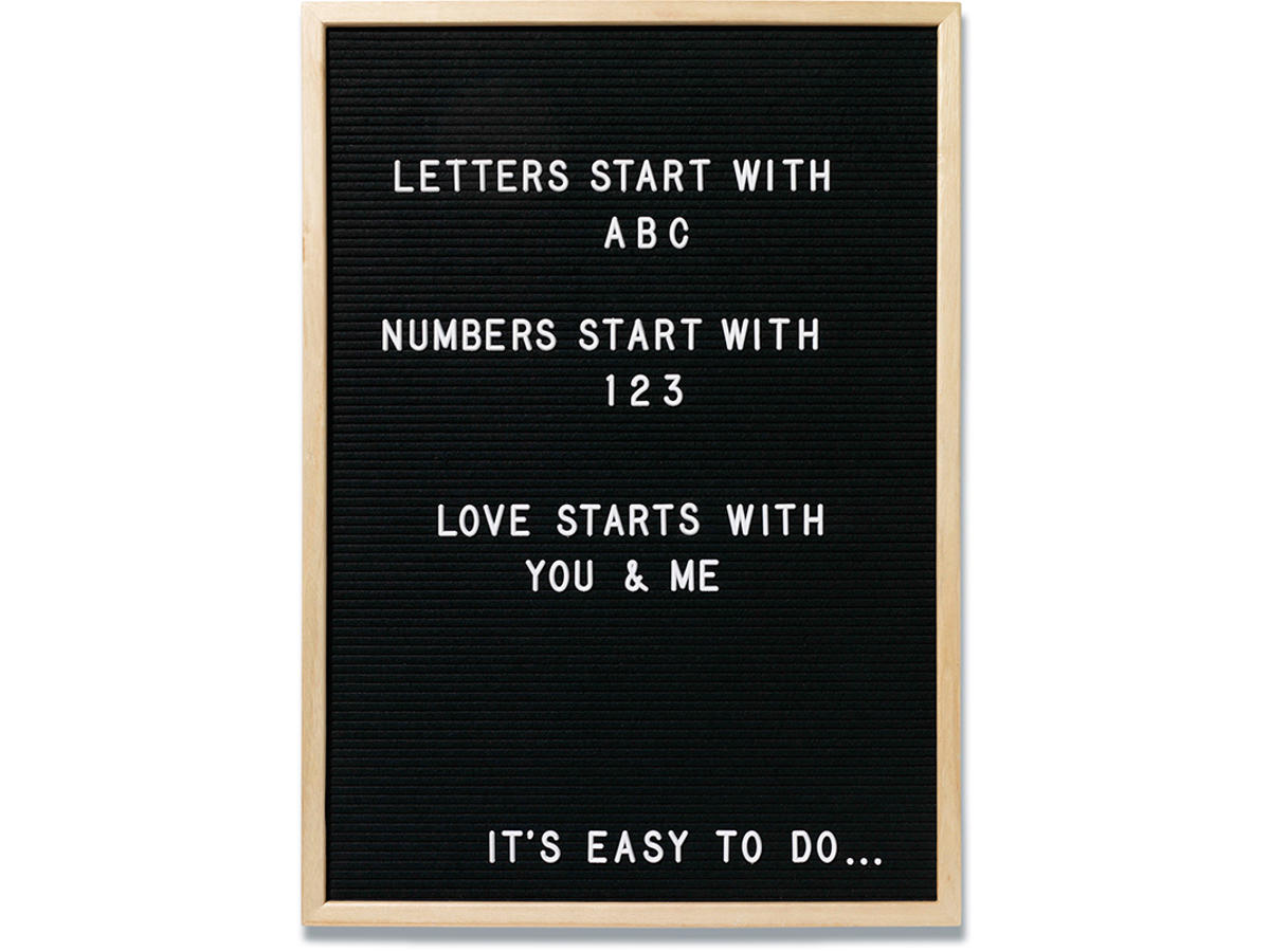 Incl. 149 stk. udskiftelige, hvide bogstaver og tal, højde 2,5 cm.