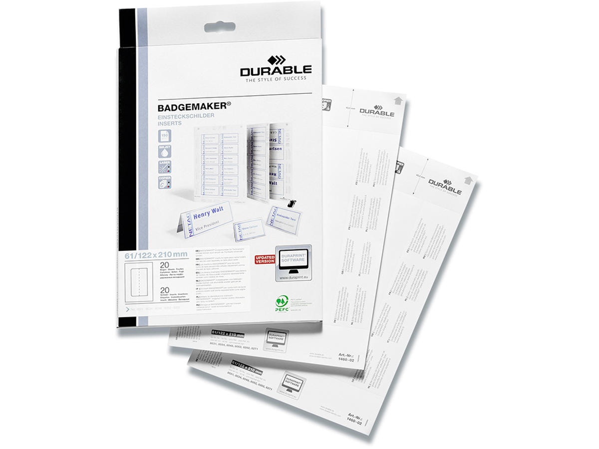 Hvide indstik til bordnavneskilte 61x210mm på 150 g A4 ark. Velegnet til udskrivning i laser, inkjet eller kopi. Lette og skille ad. Pakke med 20 ark giver 20 stk. navneetiketter. Design selv med gratis skabelon på - Klik her