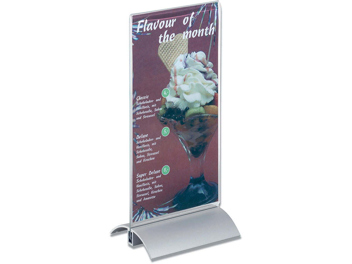 Stilren bordskilte til konferencer, møde, prisskilte, receptioner, menuholder i kantiner m v. Skilte i klar akryl, læseligt fra begge sider. Fod af aluminium. Et unikt bremsesystem i foden gør at selve skiltet altid holdes på plads. Til dokumenter i 1/3 A4 format. Mål skilte: 107x237x85mm (BxHXD)