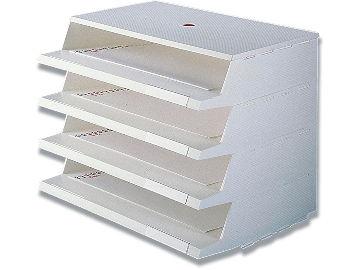 Tværvendt TWIN PANORAMA Brevbakke med 4 bakker. PANORAMA Brevbakken er let at bruge. TWIN PANORAMA Brevbakken har ingen forkant, og intet udtræk. TWIN PANORAMA Brevbakken har en åben langside, så det er nemt at få fat i breve, papirer og andet indhold.