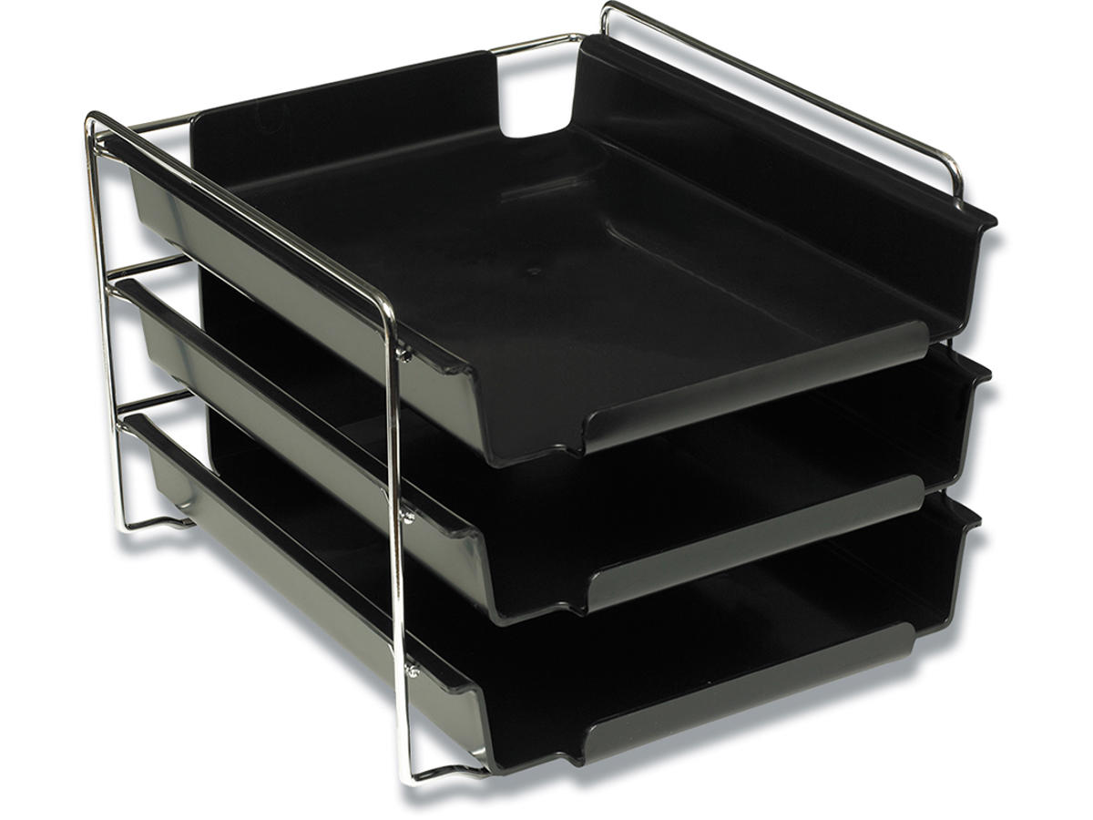 De berømte sorte Bantex Vision brevbakker inklusiv Bantex Vision brevbakkestativet i forkromet solidt metal. Her samlet alt i et. 3 brevbakker samt brevbakkestativ.