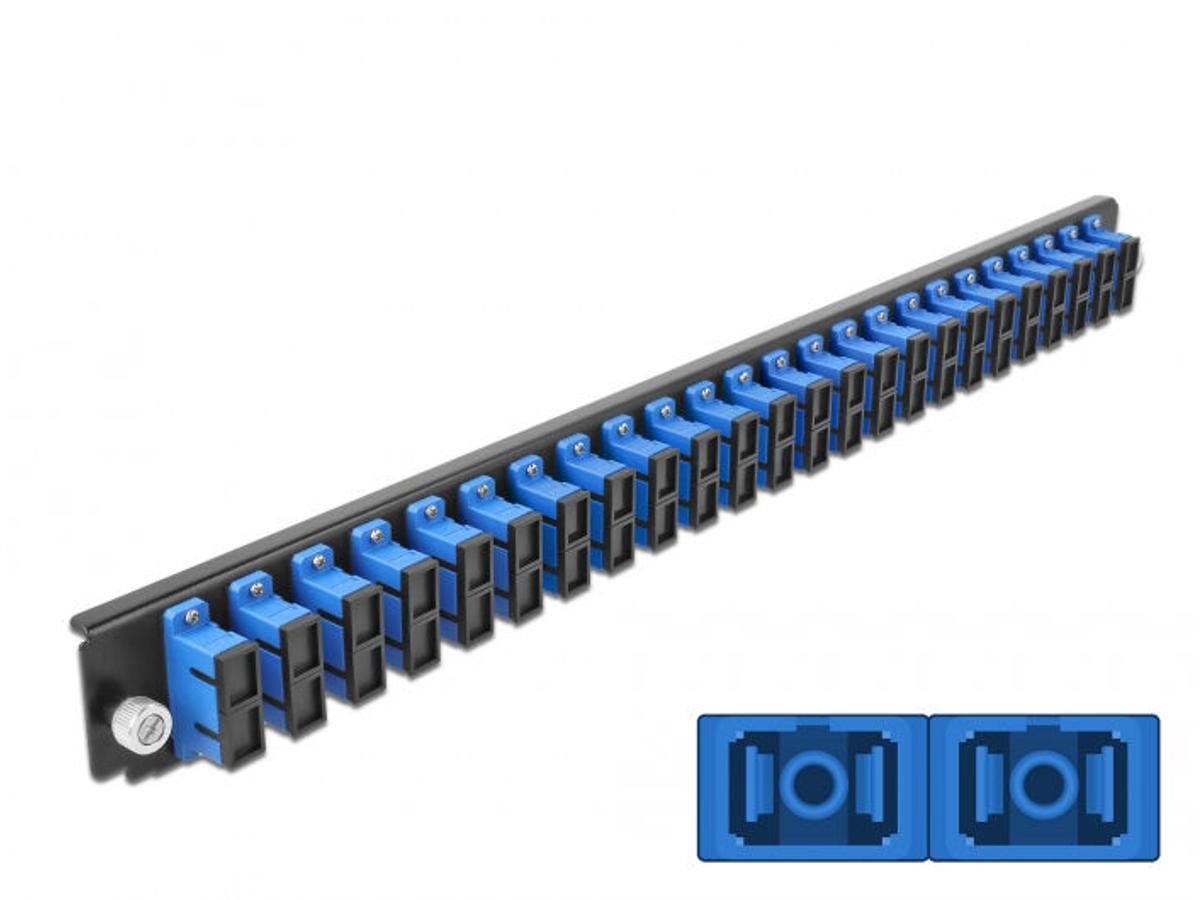 DeLOCK 43363. Understøttede kabeltyper: Fiber, Fiber optisk strømstik: SC. Montering: Reolmontering, Rackkapacitet: 1U, Produktfarve: Sort, Blå. Bredde: 44 mm, Højde: 44 mm, Dybde: 482,6 mm
