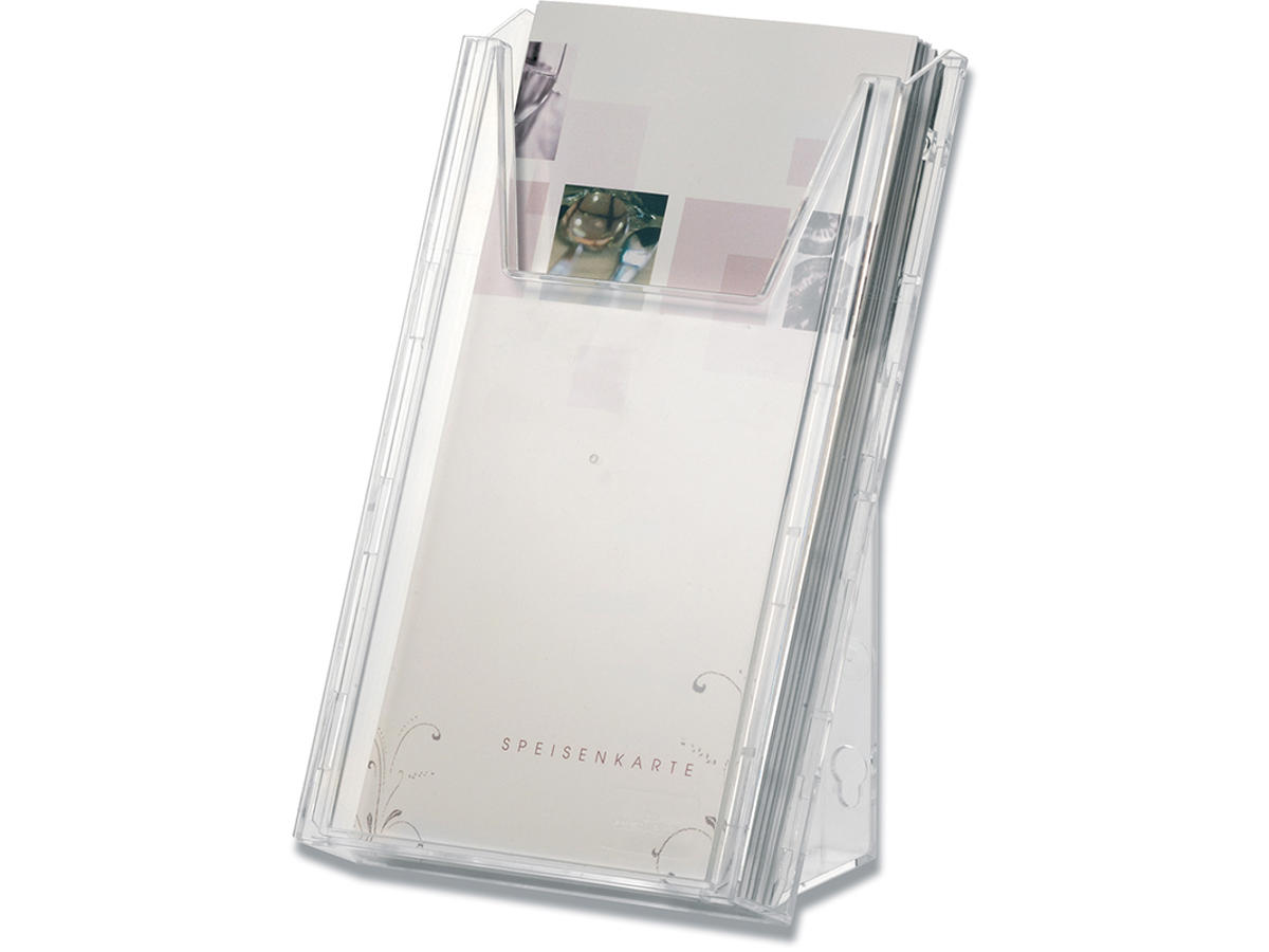 Kombiner og udbyg som det passer dig, med den multifunktionelle COMBIBOXX serien. Brochureholder i transparent plast til dokumenter i 1/3 A4 og A6 stående format op til 210x116mm. Maksimal kapacitet 24mm tykke bundter. Holder kan placeres opretstående på et bord eller sættes op på en væg ved at dreje bagpanelet/bærelementer 180 grader. Dette sæt indeholder en bakke, to bærerelementer og en frontplade som giver et komplet produkt samt et tilbehør til samling A4-holder. Kan udvides med flere 1/3 A4 enheder (Durable art nr 859819) til ca. 6 kg bæreevne. Kan også kombineres med holder i A4 format. Mål bordholder: 121x198x117mm (BxHxD), mål vægholder 121x208x111m (BxHxD)