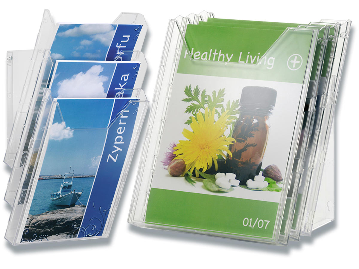 Kombiner og udbyg som det passer dig, med den multifunktionelle COMBIBOXX serien. Brochureholder i transparent plast til dokumenter lidt bredere end A4 stående 240mm, så selv mapper i A4 format får plads i. Maksimal kapacitet per fag 24mm tykke bundter. Holder kan placeres opretstående på et bord eller sættes op på en væg ved at dreje bagpanelet/bærelementer 180 grader. Dette sæt indeholder tre bakker, to bærerelementer og en frontplade som giver et komplet sæt med tre fag. Kan udvides med flere A4 enheder (Durable art nr 857919) til ca. 6 kg bæreevne. Kan også kombineres med holder i 1/3 A4 (A6 høj) format. Mål bordholder: 242x291x217mm (BxHxD), mål vægholder 242x445x152mm (BxHxD)