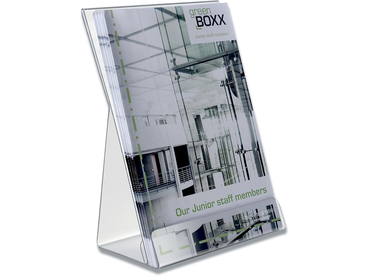 Holder i transparent plast med dobbelt anvendelse: Bordskilt: Et A5 ark kan indsættes bag. Brochureholder: Foran ryggen er plads til en mindre brochurer. Brochurestativet er "elastisk" til at holde brochure foran ryggen på plads. Leveres med skridsikre gummifødder. Minimum ordre to stykker. Mål: 150x227x85 (BxHxD)