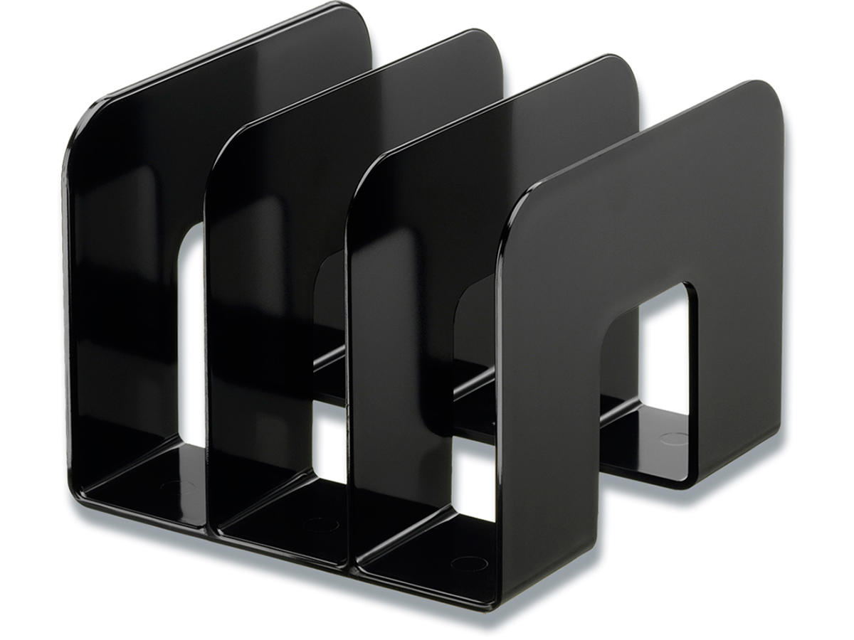 Stilren katalogholder/bogstøtte med tre rum til mapper, kataloger, bøger mm. Hvert rum er 65mm. Mål: 215x165x210mm (BxHxD)
