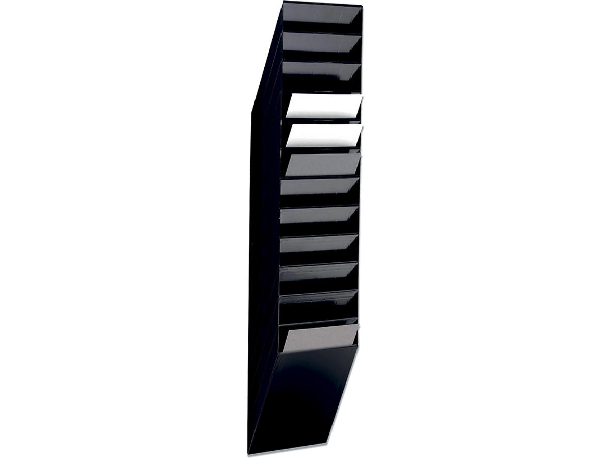 Brochurestativ med 12 bakker og en frontplade til opbevaring af brochurer og blanketter i A4 højformat. Maksimal kapacitet 24mm tykke bundter. Vægmonteres eller placeres liggende på et bord. Mål: 240x1115x135 (BxHxD)
