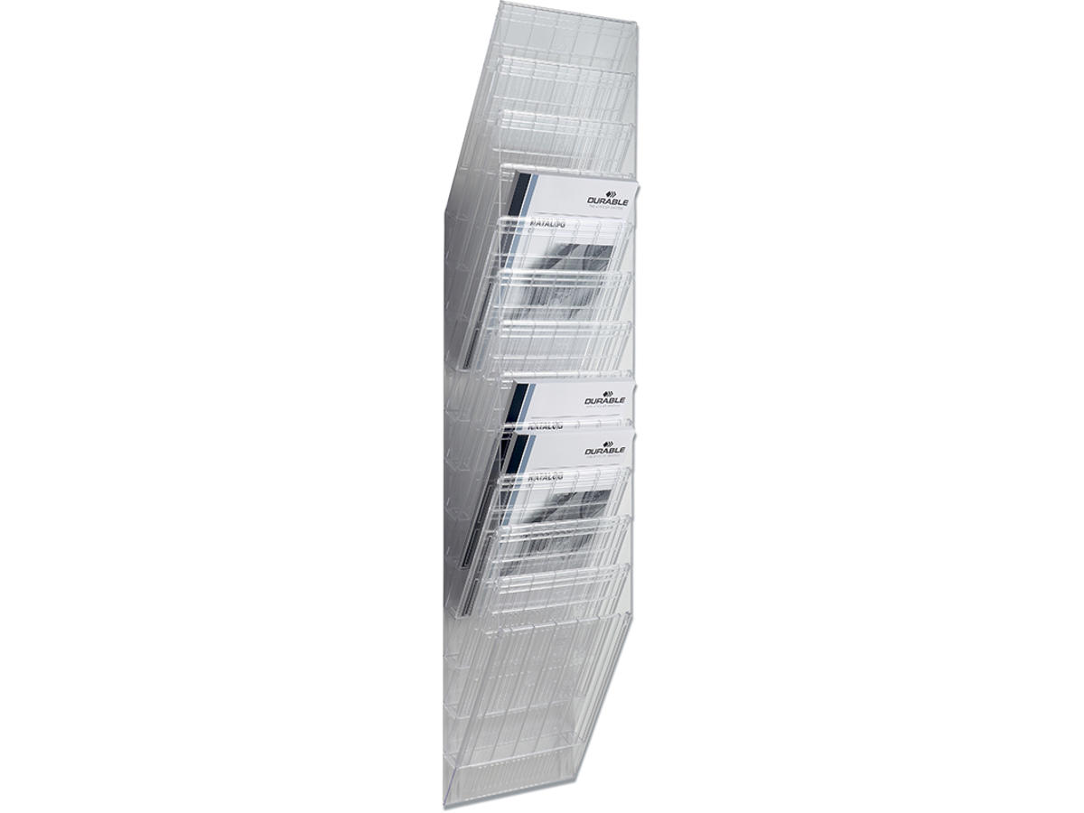 Brochurestativ med 12 bakker og en frontplade til opbevaring af brochurer og blanketter i A4 højformat. Maksimal kapacitet 24mm tykke bundter. Vægmonteres eller placeres liggende på et bord. Mål: 240x1115x135 (BxHxD)