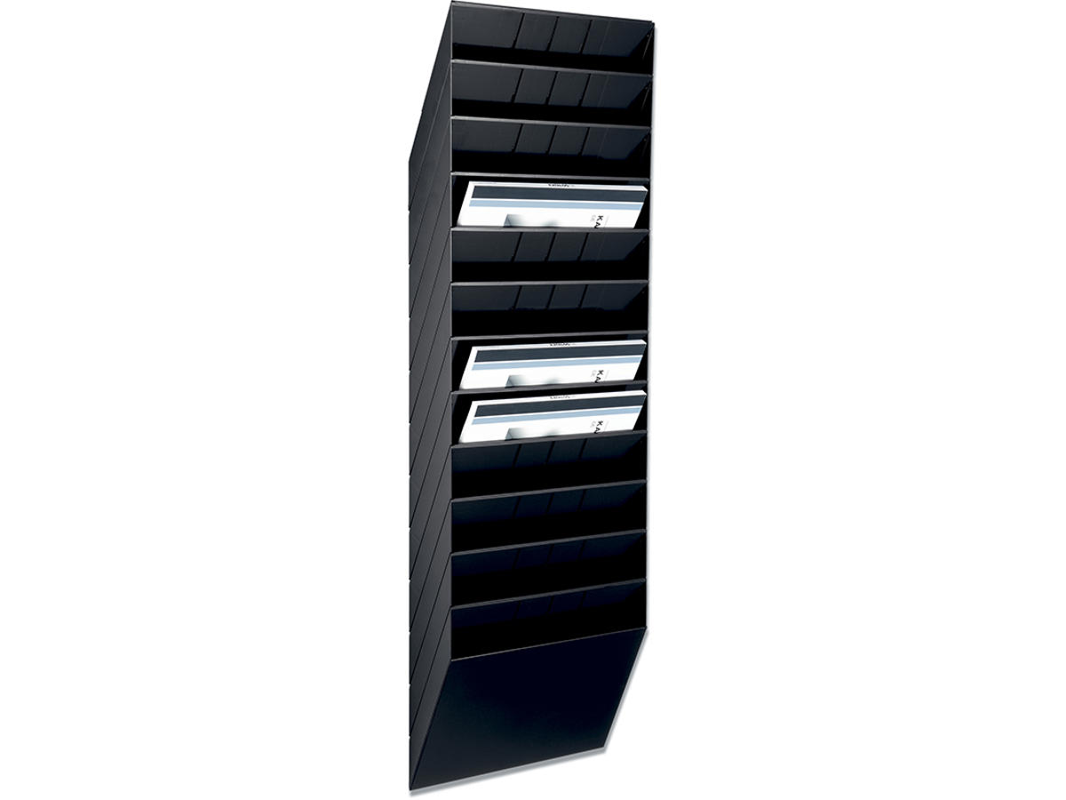 Brochurestativ med 12 bakker og en frontplade til opbevaring af brochurer og blanketter i A4 tværformat. Maksimal kapacitet 24mm tykke bundter. Vægmonteres eller placeres liggende på et bord. Mål: 348x1140x95 (BxHxD)s eller placeres liggende på et bord. Mål: 348x1140x95 (BxHxD)