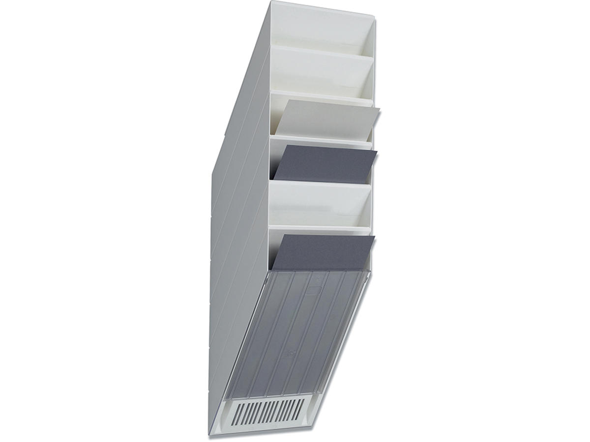 Brochurestativ med 6 bakker og en frontplade til opbevaring af brochurer og blanketter i A4 højformat. Maksimal kapacitet 24mm tykke bundter. Vægmonteres eller placeres liggende på et bord. Mål: 240x690x135 (BxHxD