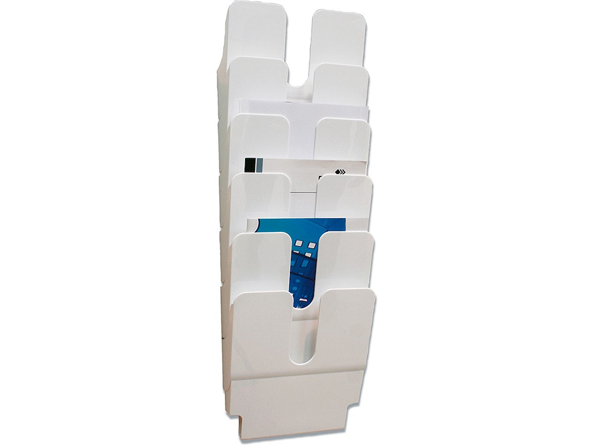 Brochure og blanketholder for brochurer i A4 højformat. Maksimal kapacitet 23mm tykke bundter. Til vægmontering, skruer indgår. Kan anvendes enkeltvis eller sammensættes, efter behov, ved at anvende snap låsen. Mål samlet 6 fag: 247x745x100mm (BxHxD) Mål 1 fag: 247x275x100 (BxHxD)