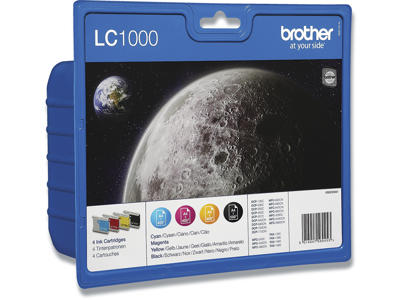 Blækpatroner, 4 stk, Sort: 500 sider Farver: 400 sider, 4 farver, Brother LC1000VALBPDR Blækpatroner, 4 stk, Sort: 500 sider Farver: 400 sider, 4 farver, Brother LC1000VALBPDR