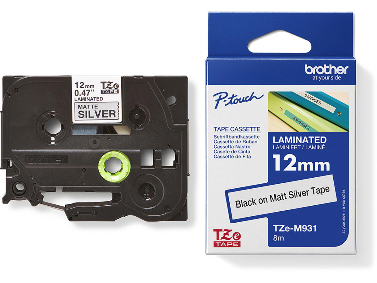 Labeltape, 12mm x 8m, Sort på Mat Sølv, 1 rulle, Brother P-Touch TZe-M931
