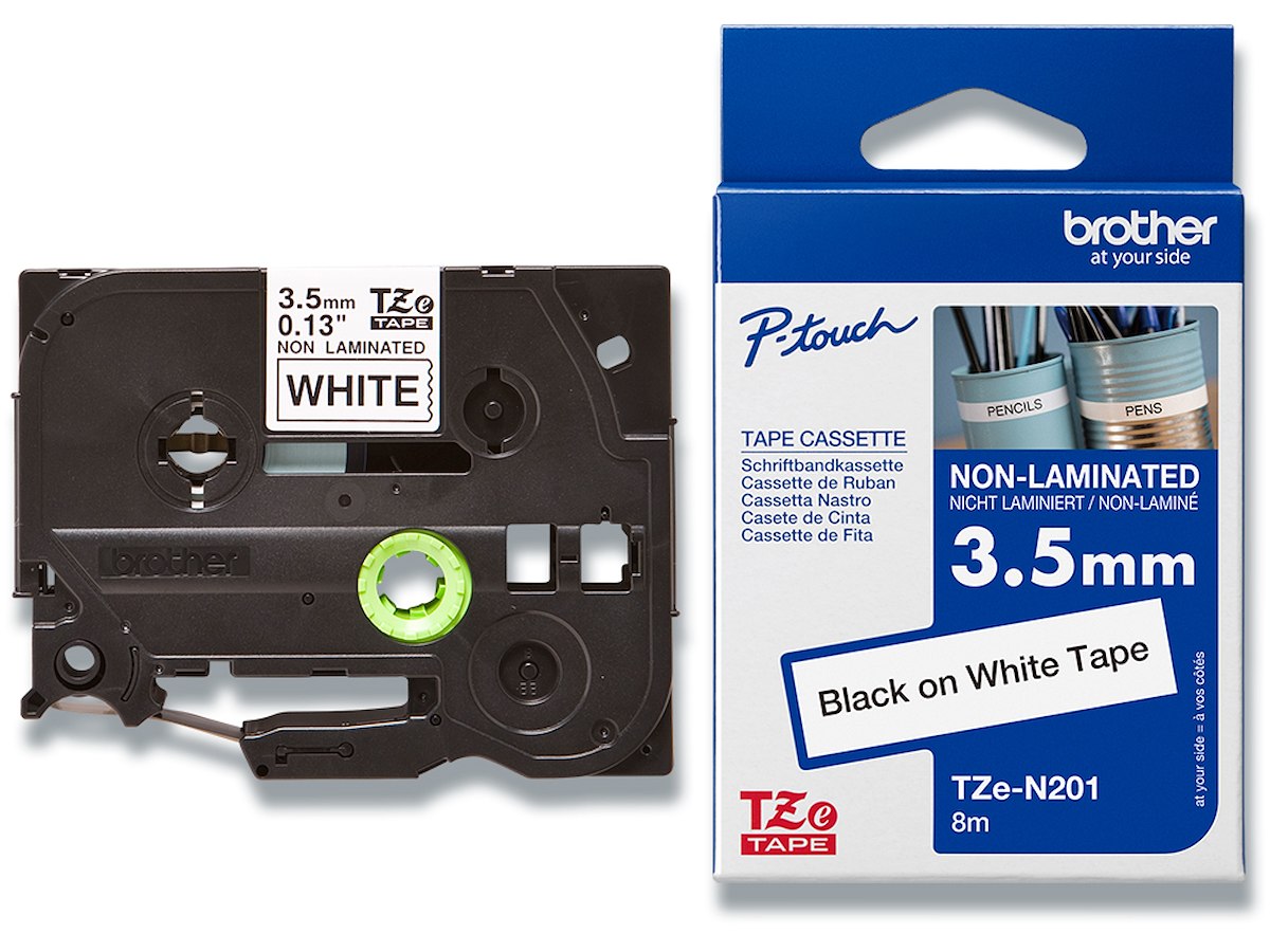 Labeltape, 3.5mm x 8m, Sort på Hvid, 1 rulle, Brother P-Touch TZe-N201