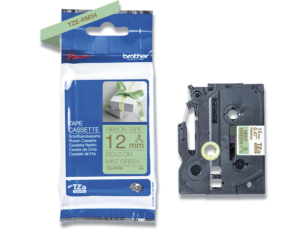 Labeltape, 12mm x 4m, Guld på Mintgrøn satin stofbånd, 1 rulle, Brother P-Touch TZe-RM34