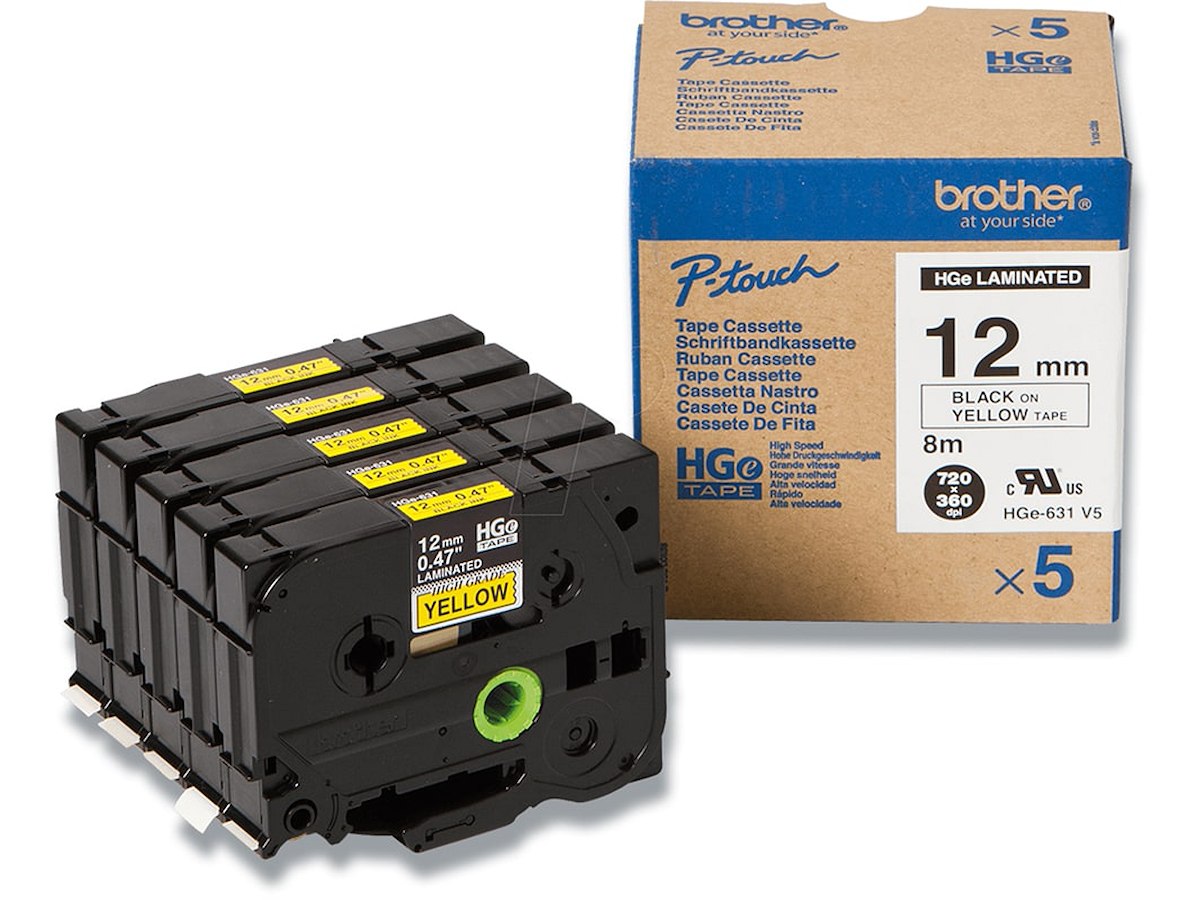 Labeltape, 12mm x 8m, Sort på Gul, 5 ruller, Brother P-Touch HGe-631V5