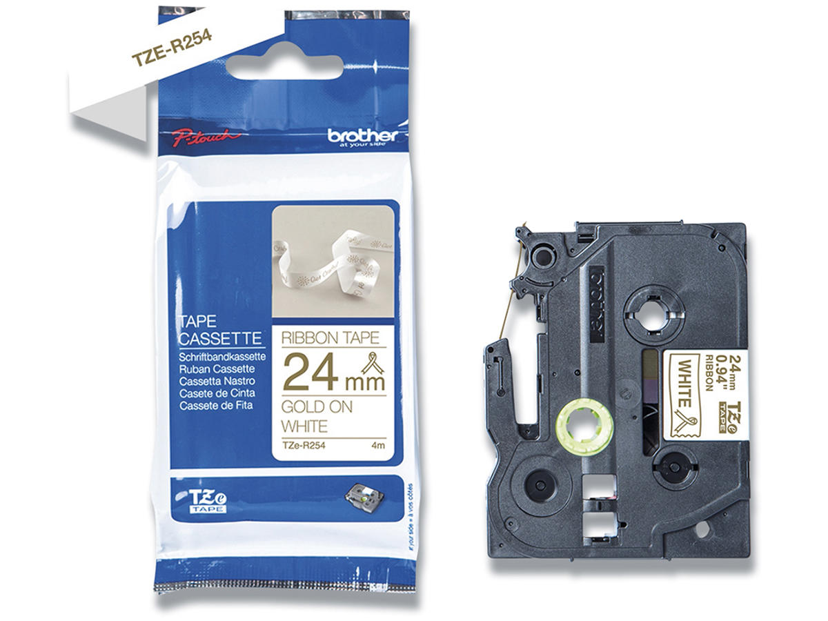 Labeltape, 24mm x 4m, Guld på Hvidt satin stofbånd, 1 rulle, Brother P-Touch TZe-R254