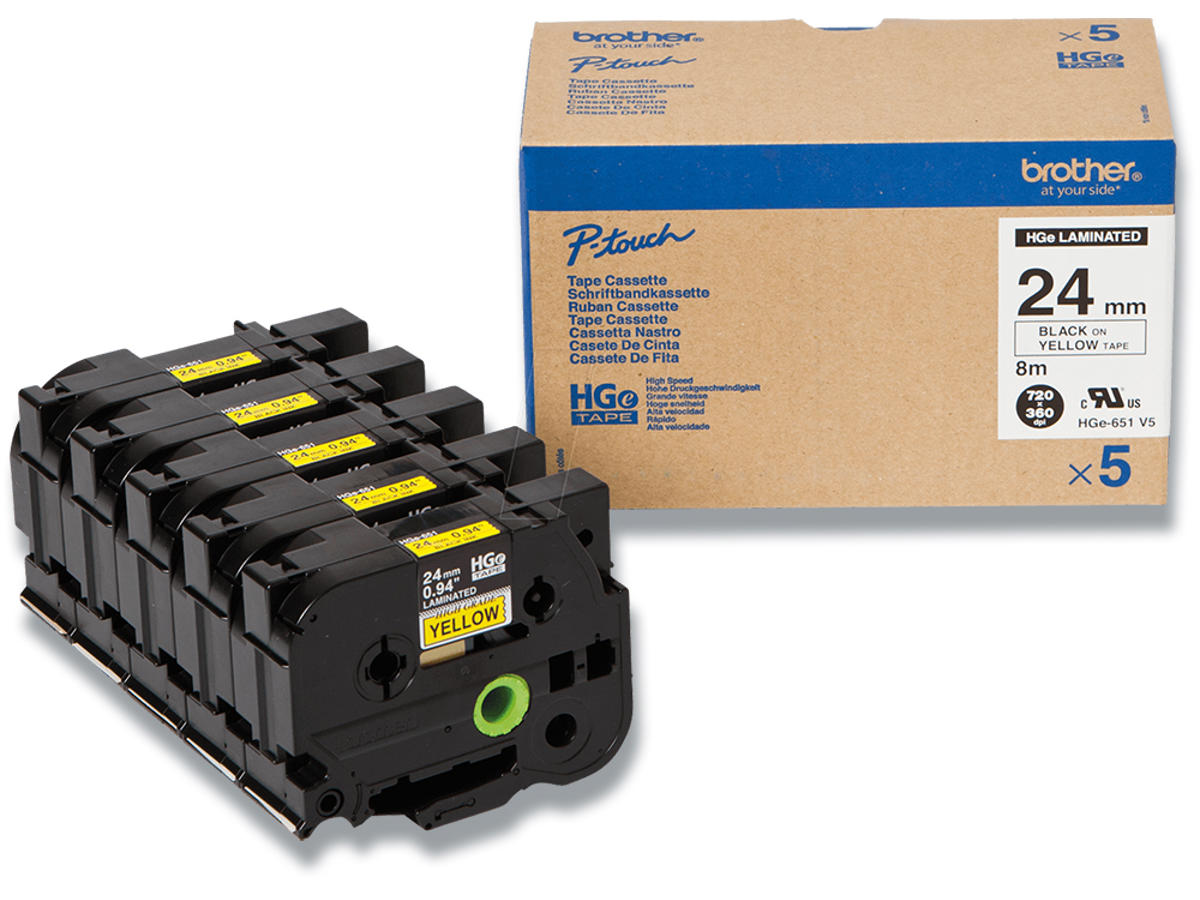 Labeltape, 24mm x 8m, Sort på Gul, 5 ruller, Brother P-Touch HGe-651V5
