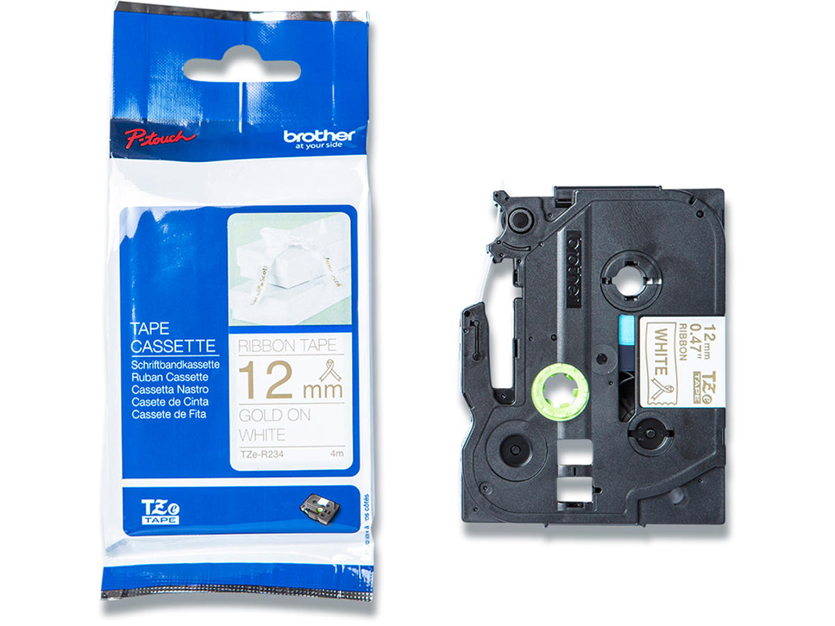 Labeltape, 12mm x 4m, Guld på Hvidt satin stofbånd, 1 rulle, Brother P-Touch TZe-R234